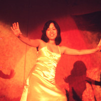 A woman dancer wearing a white satin dress, performing at Pacific University's annual Lu'au in 1976.