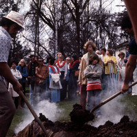 Students and family members from Hawaii shoveling dirt for the kalua pig roast at the 1976 Lu'au at Pacific University. Attendees of the Lu'au, some wearing leis, watch in the background.