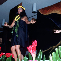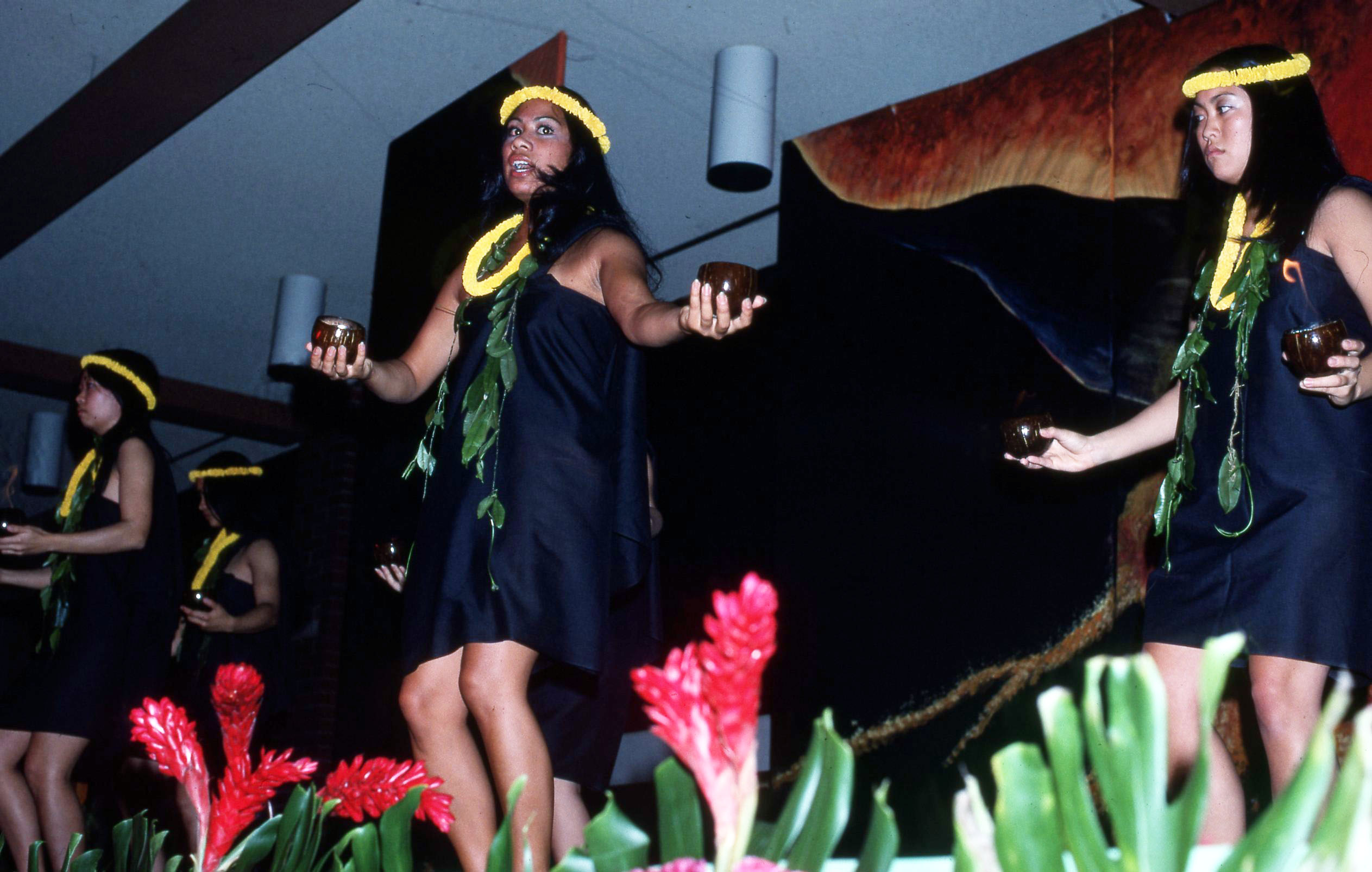 Women dancers holding what appear to be dark-colored bowls or cups, at Pacific University's annual Lu'au in 1976. The backdrop depicts a volcanic eruption.