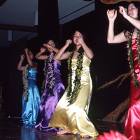 A set of women dancers wearing satin dresses and maile-style leis, performing at Pacific University's annual Lu'au in 1976. These may have been "Princesses" in the Lu'au's "Court". In many years, the Lu'au featured performances of women dancers each wearing a different colored dress, who would each represent one of the Hawaiian islands. They would perform solo dances for a "King" and "Queen," who would watch from the stage.