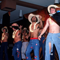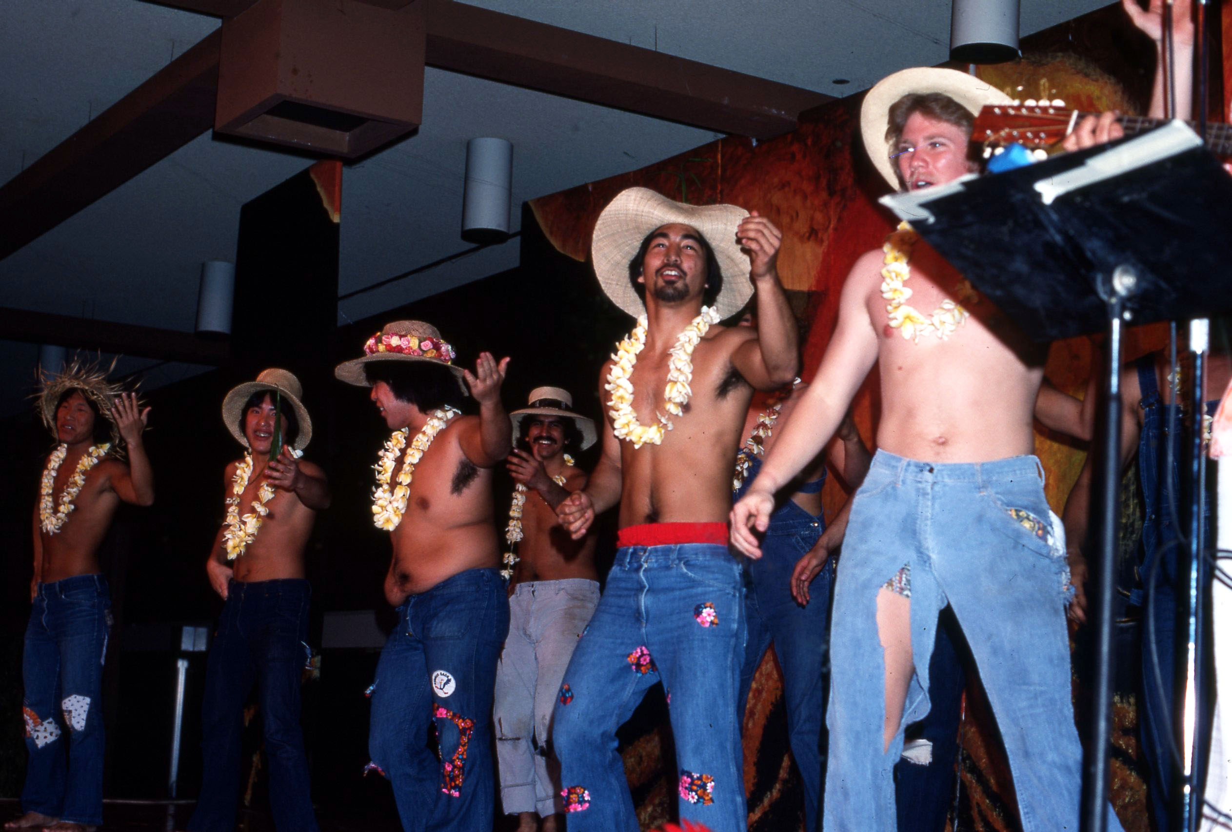 A group of male student performers wearing jeans and overalls, on stage at Pacific University's annual Lu'au in 1976.
