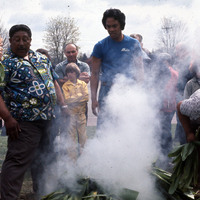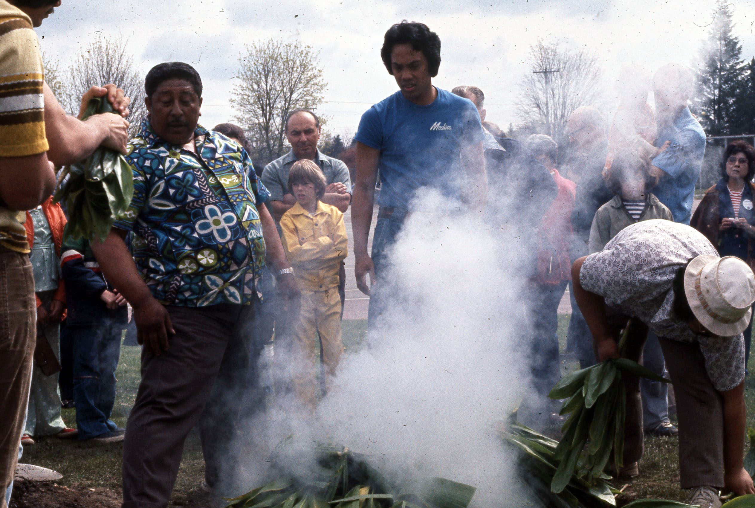 Students and family members from Hawaii roasting a pig for the 1976 Lu'au at Pacific University. Leaves for the roast are visible in the foreground. Other community members watch in the background.