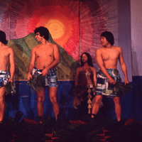 Pacific University students wearing blue malo, performing a dance on stage at the university's annual Lu'au in 1975. The photographer, Peg Osland, was on the staff of Pacific's publicity department.