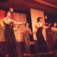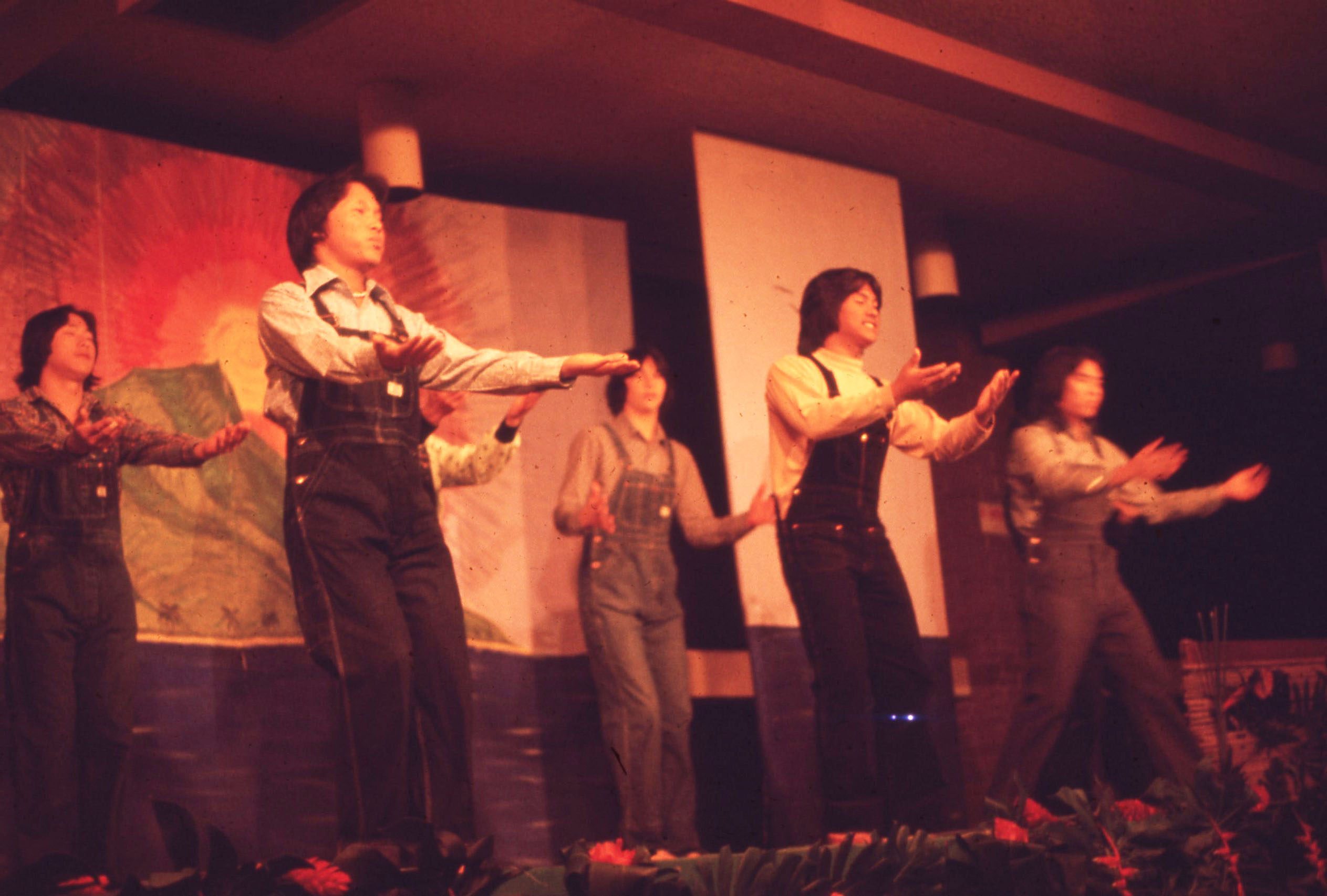 Pacific University students dressed in overalls, performing a dance on stage at the university's annual Lu'au in 1975. The photographer, Peg Osland, was on the staff of Pacific's publicity department.