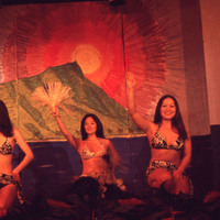 A group of women students performing a Tahitian-style dance on stage at Pacific University's annual Lu'au in 1975. Two are wearing Tahitian-style grass skirts and holding grass hand tassels; the other two are wearing matching bikini tops and skirts. The photographer, Peg Osland, was on the staff of Pacific's publicity department.