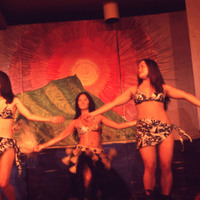 A group of women students performing a Tahitian-style dance on stage at Pacific University's annual Lu'au in 1975. Two are wearing Tahitian-style grass skirts and holding grass hand tassels; the other two are wearing matching bikini tops and skirts. The photographer, Peg Osland, was on the staff of Pacific's publicity department.