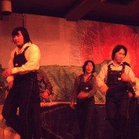 Pacific University students performing a dance in overalls on stage at the university's annual Lu'au in 1975. The photographer, Peg Osland, was on the staff of Pacific's publicity department.