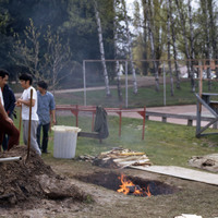 A group of students and/or family members tend the kalua pig pit roast at Pacific University's annual Lu'au in 1972.