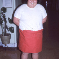 - Elton Sumida, a Pacific University student (class of 1973), dressed in a red cap and skirt in December, 1971. This image may have been taken during a Haumana O Hawai'i (Hawaiian Club) holiday event.