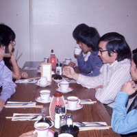 Pacific University students and/or friends Craig Shimabukuru (class of 1975), Jeff [Yokomura?], Dexter Takashima (class of 1972), [Alan?] Arakawa, and Jeff Anzai, eating at a Chinese restaurant in December, 1971. This image may have been taken during a Haumana O Hawai'i (Hawaiian Club) holiday event.