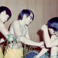 Three male Pacific University students dressing for their performance at the Haumana O Hawai'i Homecoming Dance in October, 1971. They are identified on the original slide as: Brian Matsumoto; Jeff Anzai; and Craig [Shimabukuru].