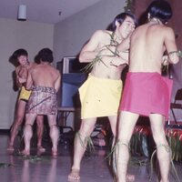 Three male Pacific University students performing at the Haumana O Hawai'i Homecoming Dance in October, 1971. Three of them are identified on the original slide as: Brian Matsumoto; Irving Soto; and Jeff Yokomura.