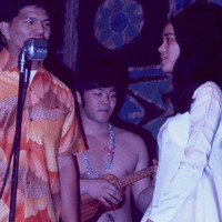 Pacific University students performing at the university's annual Lu'au, probably in 1971. The are identified on the original slide as Don Aina (Class of 1973) and Millie Ah Ching. Ching is dressed in white as the "Queen" of the Luau. The image is dark and underexposed.