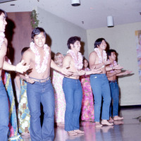 Five male Pacific University student performers dressed in blue pants at the Haumana O Hawai'i Homecoming Dance in October, 1971. They are identified on the original slide from left-to-right as: Lyle [Ikehara, Class of 1975], Dennis [Kagawa or Ribellia?], Irving [Soto, Class of 1975], Wayne [Gushiken, Class of 1972], and Rocky [Balada, Class of 1976]. A line of women dancers stands behind them.
