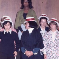 Pacific University women students on stage wearing straw boater hats with red ribbons and kimono-style shirts. This photograph was likely taken during the entertainment portion of a dinner event thrown by Freshman at Pacific University at Homecoming in October, 1970. It took place in the Multi-Purpose Room (MPR) of Washburne Hall.
