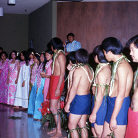 Student performers lined up on stage at Pacific University's annual Lu'au in 1970.