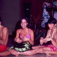 Four student performers sitting on the ground near the stage at Pacific University's annual Lu'au in 1970. They are identified on the original slide as: Guy Nishizawa; Mia Akau; Eric Chu; and Colleen Keliikoa.