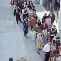 The entrance line of audience members for Pacific University's annual Lu'au in 1968. The audience members, who included students and their family members, are lining up on the patio of Washburne Hall.