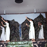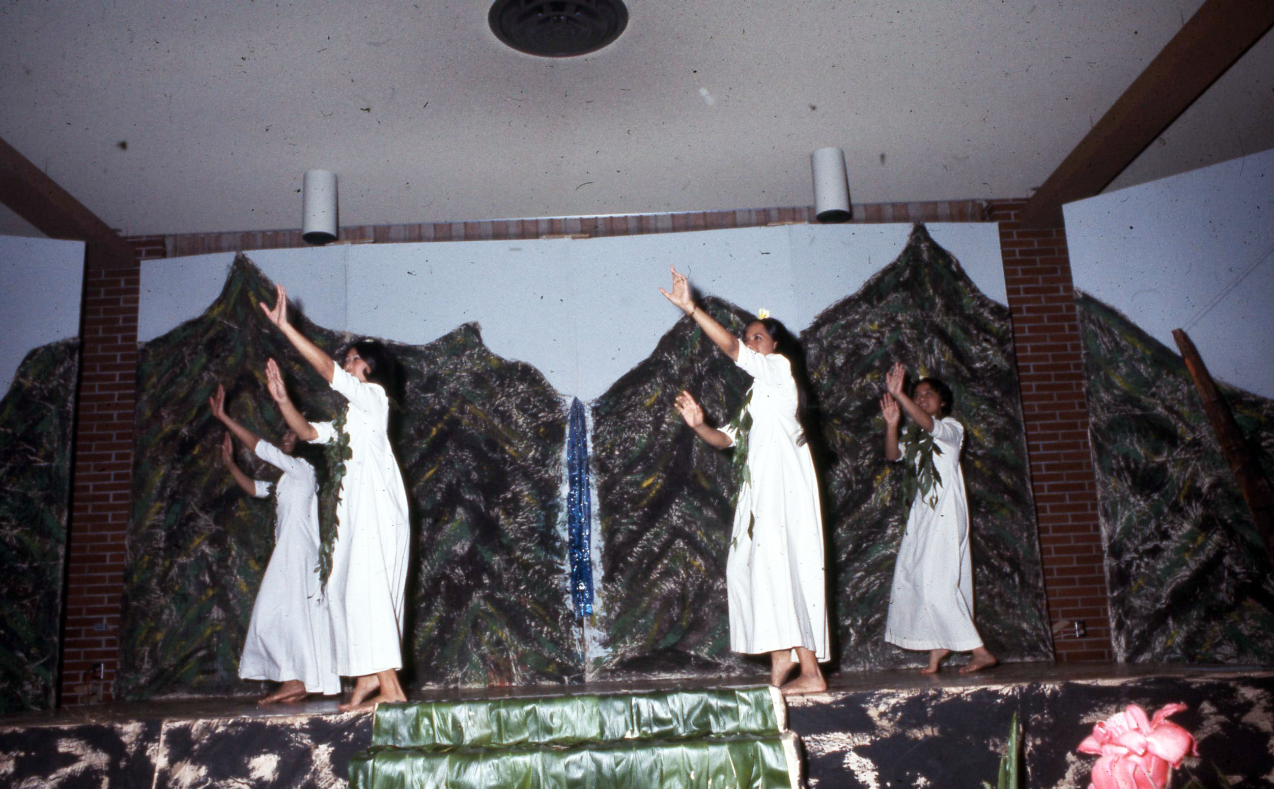 Four women dancers wearing white dresses at Pacific University's annual Lu'au in 1968.