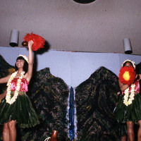 Several women performers at Pacific University's annual Lu'au in 1968. They are wearing ti leaf skirts and holding 'uli'uli (traditional feathered rattles).