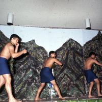 Four men wearing blue malo or lavalava -style skirts, on stage at Pacific University's annual Lu'au in 1968.