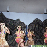 Four women performing a Tahitian-style dance at Pacific University's annual Lu'au in 1968. They are wearing grass skirts with tasseled belts and holding i'i (hand tassels).