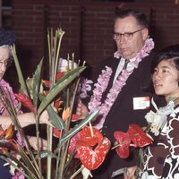 An older couple purchasing flowers from a vendor at Pacific University's annual Lu'au in 1968. According to his name tag, the man is Sidney Chaffee. The Haumana O Hawai'i Club, which hosted the event, organized air shipments of fresh flowers, fruit, and other goods from Hawaii to sell at vendor tables during the event.