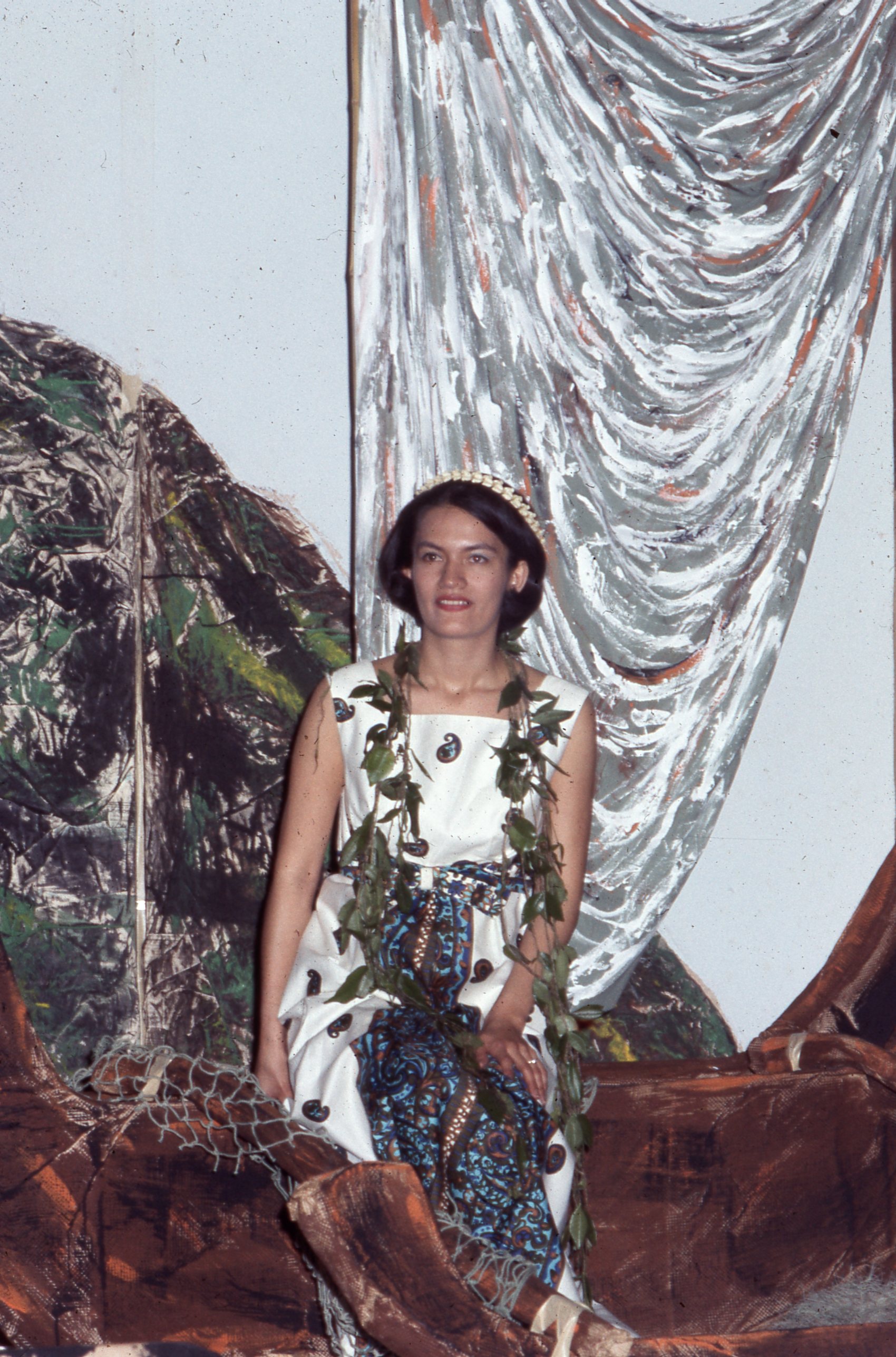 A performer wearing a white dress, sitting on a canoe set piece on stage at Pacific University's annual Lu'au in 1968.