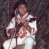 A student playing a guitar on stage at Pacific University's annual Lu'au in 1968.