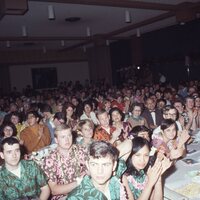 A wide view of the audience in attendance at Pacific University's annual Lu'au in 1968. Many of those present were students; others include the families of the Lu'au performers, university staff and local community members. Much of the audience is dressed for the occasion in colorful aloha shirts, muumuus, and leis. The remains of the kalua pig dinner that was served at each Lu'au are on the tables. This photograph was taken in Washburne Hall.
