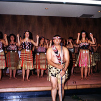 A male performer at a microphone, standing in front of a group of Pacific University students and parents, who are performing a Maori-style dance in October, 1967. A note on the back of a matching slide identifies this event as having occurred at a "Frosh Dance" on campus. The dancers are wearing piupiu skirts. The performance was likely organized by the students' Hawaiian Club, Haumana O Hawai'i.