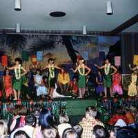 Dancers perform for the "Royal Court" on stage at Pacific University's annual Lu'au in 1967. The event, which was hosted by the Haumana O Hawai'i club, featured the presentation of a "King" and "Queen" with attendants. In this image, six female dancers wearing green perform at the front of the stage. In the background: the backdrop depicts Diamond Head as seen from Waikiki Beach on Oahu. The King, wears a red and yellow cape, was Don Aina (Class of 1973). The Queen, wearing a white dress, was Sheila Manus (Class of 1967). Two male students stand behind them, carrying red and yellow standards, which were meant to represent kāhili, the traditional feathered symbols of Hawaiian royalty. Female students sitting on either side of them were "princesses representing the eight major islands in the Hawaiian chain, come to honor the King and Queen." (The Index, Apr. 11, 1966, p. 1)