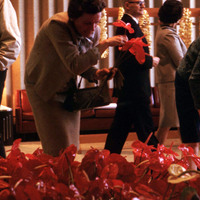 An attendee of Pacific University's annual Lu'au in 1966 purchasing anthurium flowers. Leis, which were likely also for sale, are visible in the background. The Haumana O Hawai'i Club, which hosted the event, organized air shipments of fresh flowers, fruit, and other goods from Hawaii to sell at vendor tables during the event.