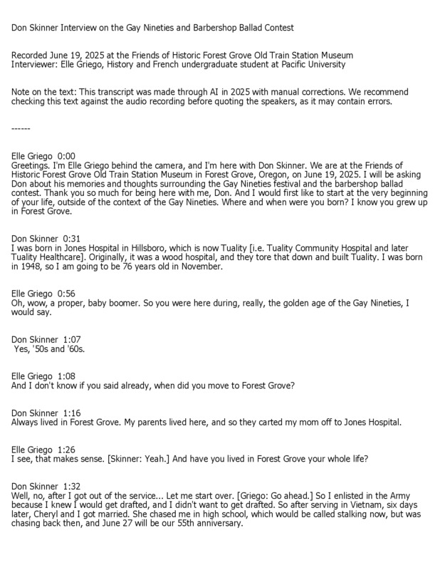 Don Skinner oral history interview on the Gay Nineties and Barbershop Ballad Contest, recorded June 19, 2025 at the Friends of Historic Forest Grove Old Train Station Museum in Forest Grove, Oregon. Born in 1948, Skinner grew up in Forest Grove and served in the Vietnam war as a Photographic Laboratory Specialist in the Army before working for and retiring from Tektronix. He and his wife Cheryl are responsible for putting together the Old Train Station Museum as it is today. Elle Griego, the interviewer, was a History and French undergraduate student at Pacific University from 2022-2026.