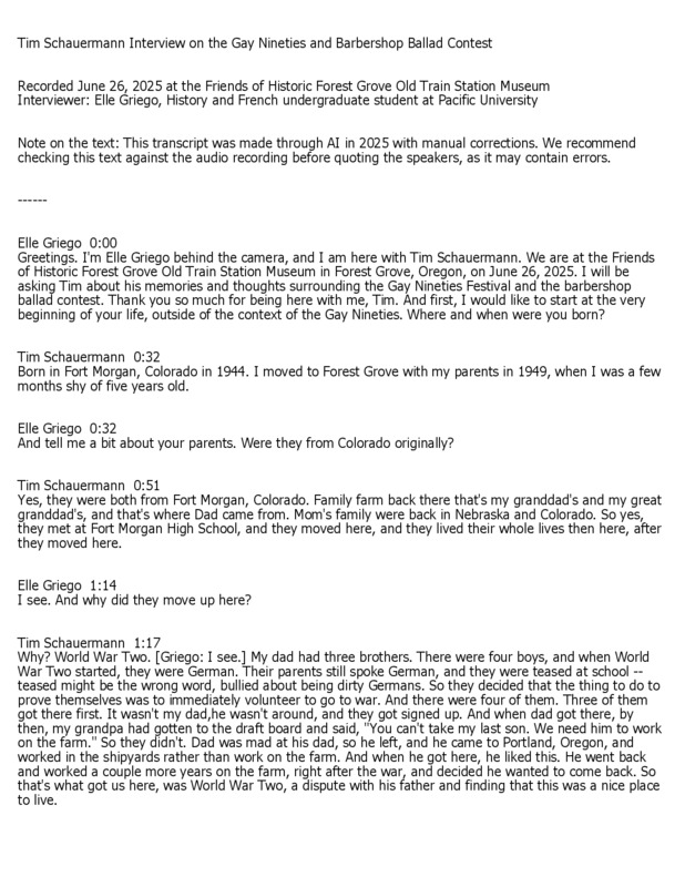 Tim Schauermann oral history interview on the Gay Nineties and Barbershop Ballad Contest, recorded June 26, 2025 at the Friends of Historic Forest Grove Old Train Station Museum in Forest Grove, Oregon. Elle Griego, the interviewer, was a History and French undergraduate student at Pacific University from 2022-2026.