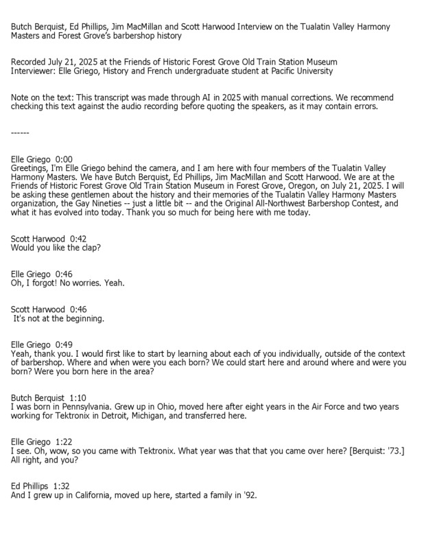 Butch Berquist, Ed Phillips, Jim MacMillan and Scott Harwood oral history interview on the Tualatin Valley Harmony Masters (TVHM) and Forest Grove’s barbershop history, recorded July 21, 2025 at the Friends of Historic Forest Grove Old Train Station Museum in Forest Grove, Oregon. Elle Griego, the interviewer, was a History and French undergraduate student at Pacific University from 2022-2026.