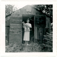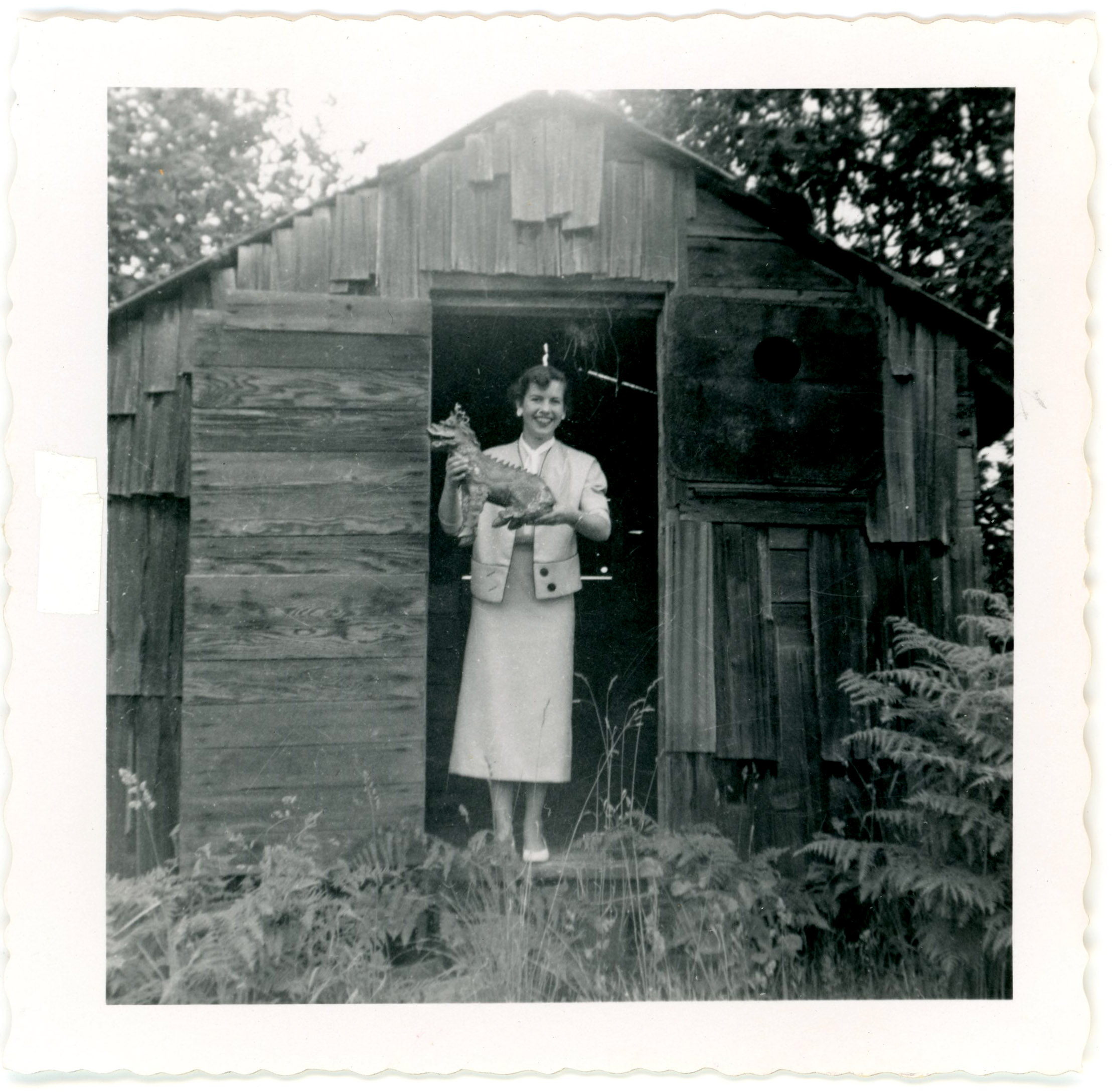 Dorothy ("Dottie") Generaux, of the Pacific University Class of 1959, posing with "Boxer" in front of the door to a rustic shack, with ferns in the foreground. This is one of a set of photographs taken in 1957 by a member of Pacific University's Phi Beta Tau fraternity. Members of the fraternity had won the statue and offered to take Dorothy to see it one Sunday, just as she was leaving church. She agreed, and they drove with her to a field near Gales Creek, where she posed with Boxer.