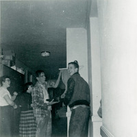 Pacific University students laughing after the "tubbing" of several boys in Herrick Hall, a girls dormitory on campus, in January, 1956. The two boys were Don Dupuy and Gary Williams (Class of 1957) according to a note on the back of the photograph. The girls were apparently residents of Herrick Hall. According to the photographer, student Dorothy Dobyns Generaux (Class of 1959), the boys had just "flashed" (i.e. briefly shown) the original Boxer statue. The girls who lived in Herrick Hall playfully punished them by forcing them into a bathtub full of water while fully clothed. This is one of a set of three photographs from the same event; see PUA_MSFILE_169_006 and PUA_MSFILE_169_007.