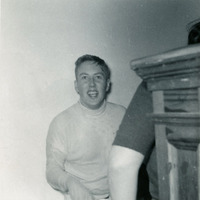 Pacific University student Jon Rudi (Class of 1957) just after having been "tubbed" in Herrick Hall, a girls dormitory on campus, in January, 1956. According to the photographer, student Dorothy Dobyns Generaux (Class of 1959), several boys including Don had just "flashed" (i.e. briefly shown) the original Boxer statue. The girls who lived in Herrick Hall playfully punished them by forcing them into a bathtub full of water while fully clothed. This is one of a set of three photographs from the same event; see PUA_MSFILE_169_005 and PUA_MSFILE_169_007.