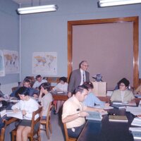 A group of Pacific University students studying at tables with many books and papers set in front of them. A man, probably a professor, stands towards the back. A projector is on a podium and the window shade is drawn, indicating that they may have been watching a slideshow. The room resembles Pacific's Carnegie Hall before it was renovated. It might have been taken after the campus library was moved from Carnegie to Scott Hall, but before the ceiling heights were lowered in 1969. The original slide is dated 1967 in pencil.