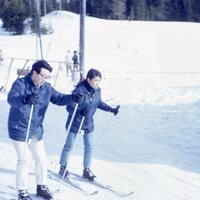 - Two Pacific University students skiing in 1968, probably at Mount Hood. They are on a beginner's slope with a tow rope on the right. Based on other related images, this may have been taken during a Haumana O Hawai'i (Hawaiian Student Club) outing.