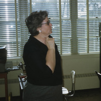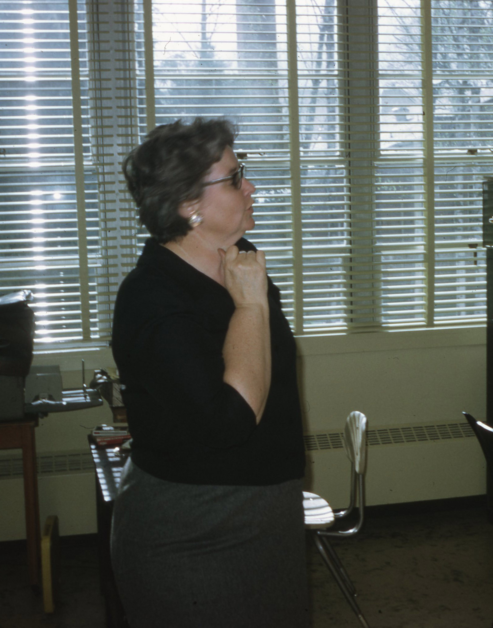 - A woman, likely a member of Pacific University's staff or faculty, in a campus building. This may have been taken inside Scott Library; the machine behind her appears to be a microfiche card reader. This image is dated April 1968.