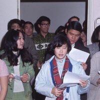 A group of Pacific University students, probably members of Haumana O Hawai'i (Hawaiian Club), gathered in a doorway. Based on the portable curtain on the right, the room appears to be in a medical or rehabilitation setting. This may have been a club visit to an ill community member. Several students are holding sheets of paper; which may have had the lyrics to a song they were singing. The slide was printed in November, 1968.