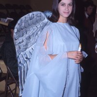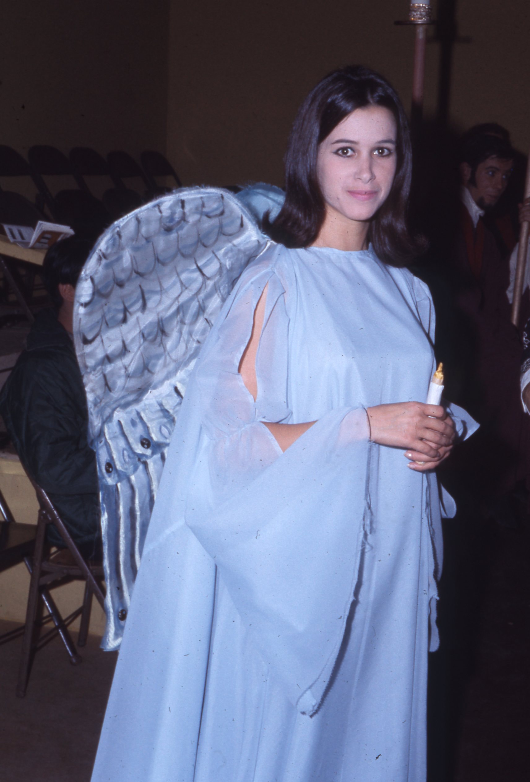 - A woman, probably a Pacific University student, dressed as an angel and holding a prop candle. Chairs on risers are visible in the background. This photograph was likely taken at a theatre or holiday event held on campus. The slide was printed in November, 1968.