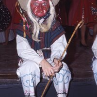 A Pacific University student wearing a mask and a costume, while other students in the background wear red dresses and head coverings. Based on other images that show the same costumes, this was likely taken at a performance of "The Royal Hunt of the Sun," which ran at Pacific's Tom Miles Theater in February-March, 1968. The actors, who were students at Pacific University, wore costumes inspired by Mexican folk dress. The plot centered on the conquest of the Incan Empire of Peru by the Spanish conquistador Pizarro. The slide was printed in November, 1968. For another view of the same student without the mask, see PUA_PeoSlides_044.