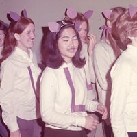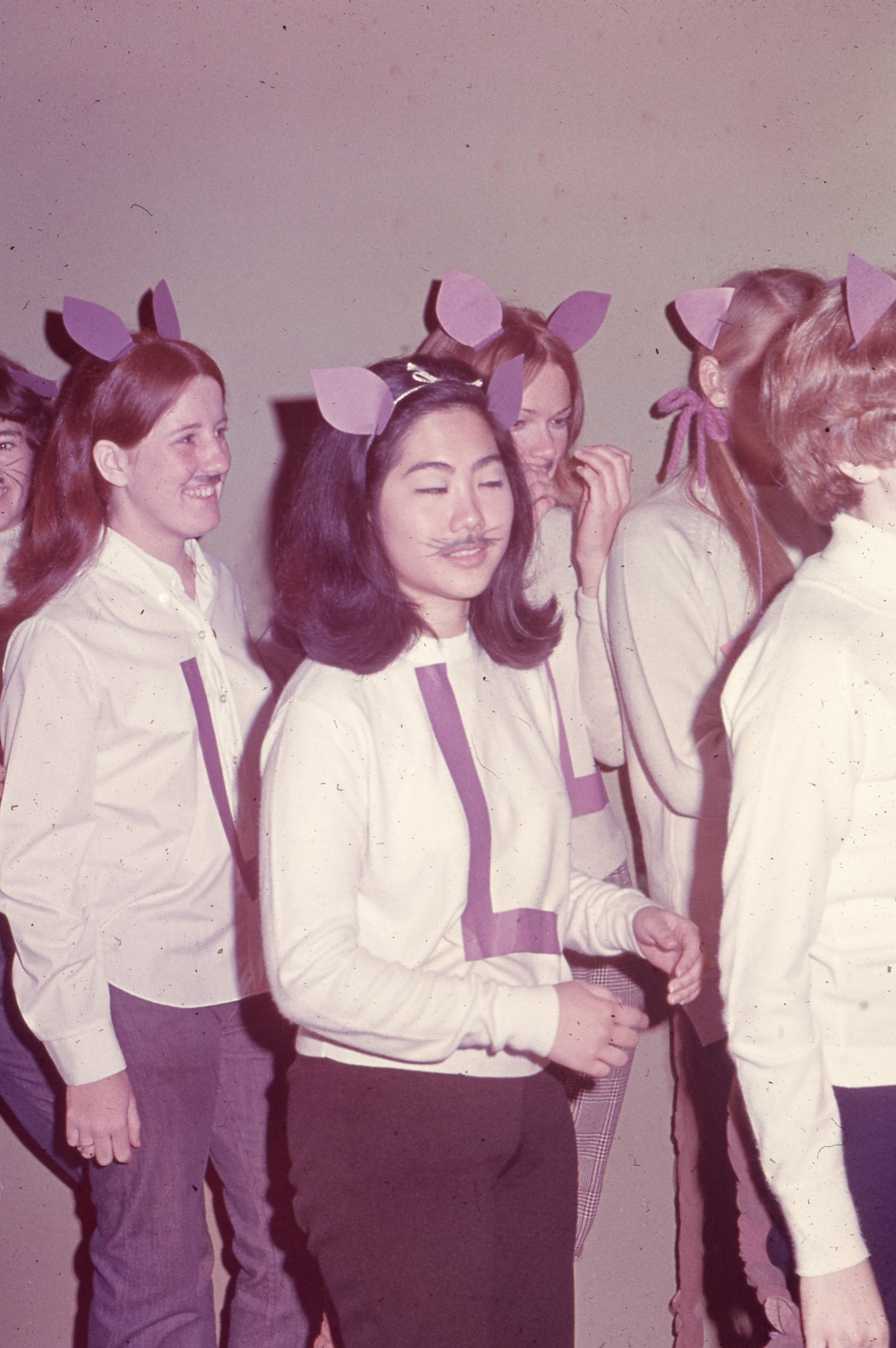 A group of young women dressed as mice, with shirts that have a large purple "L" on them. Two of the women are identified on the original slide as Val Dudley (Pacific University Class of 1973) and Charlotte Yoshimura. They may have been mocking students from Pacific's usual Homecoming rival, Linfield College, whose color was purple. This image likely dates from 1969-1971.