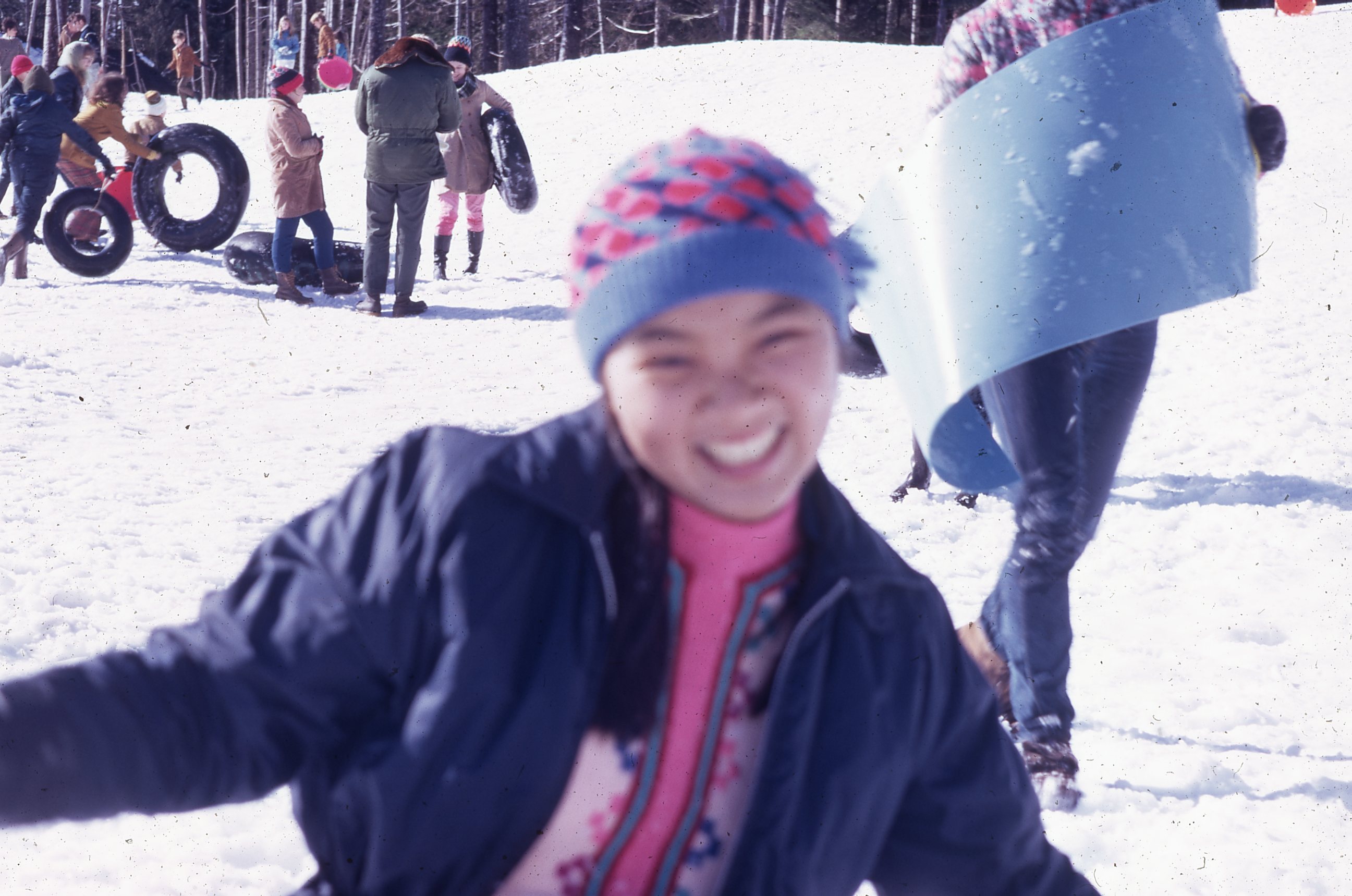Pacific University student Cathy Chung (Class of 1973) on a Haumana O Hawai'i (Hawaiian Club) ski trip to Mount Hood in 1970. The woman on the right holding a mat whose head is outside of the frame is Kathleen "Casey" McAllister. Other people sledding with inner tubes and plastic saucers are visible in the background. The original slide was printed in March 1970.