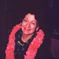 Josephine Ritchie, the wife of Pacific University President Miller Ritchie, at one of Pacific University's annual Lu'aus between 1967-1969. The original slide was printed in March 1970, but because the Lu'au always occurred in April, the likely dates from an earlier year: most likely 1967. Miller Ritchie was President of Pacific University from 1959-1970.
