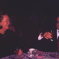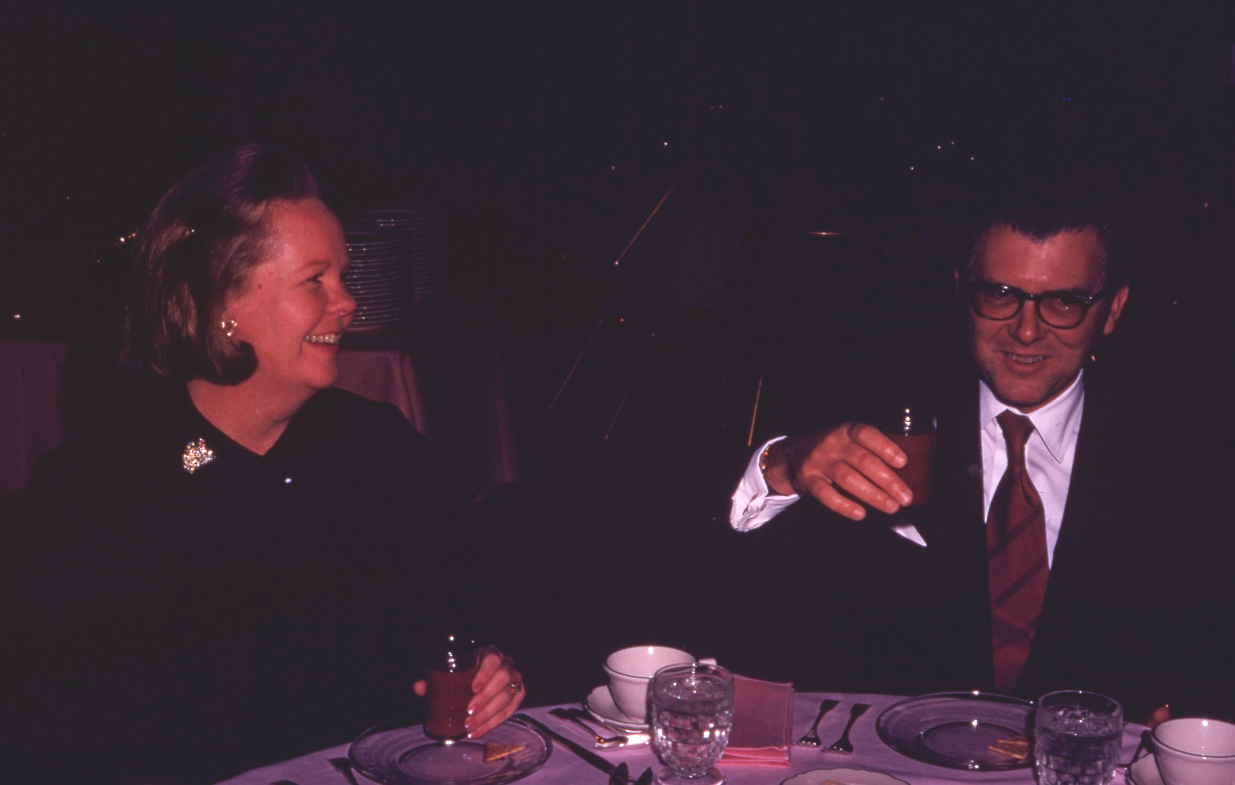 Two people attending a Pacific University Commencement, likely between 1967-1969. They are identified on the original slide as "Perrys at Commencement," with an added note inserted above that line reading "Bill." This might be William J. Perry, who would become the U.S. Secretary of Defense in 1994, and his wife; or possibly another couple with the same last name. The slide was printed in March 1970, but because Commencement takes place in May, this more likely dates from an earlier year, circa 1967-1969.