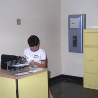 - A woman, most likely a student worker based on her casual dress, sitting at a typewriter in a Pacific University office in 1970.